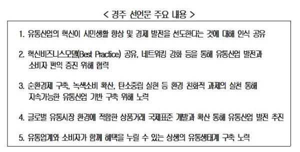 이번 행사는 APEC CEO Summit(10월 28~31일)의 공식 부대행사로‘글로벌 유통산업의 혁신과 미래’를 주제로 정부·기업·학계 등 국내외 인사 300여 명이 참석했다. 1부 행사는 기조연설 및 경주선언 2부 행사는 글로벌 혁신 토론회로 진행됐다.