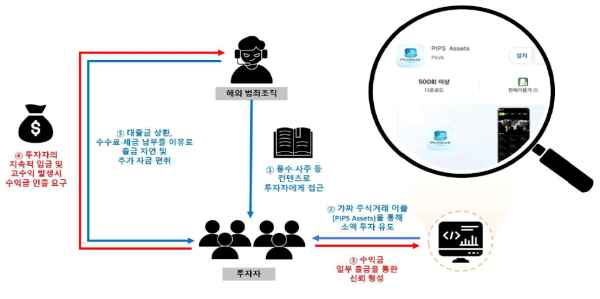 이들 범죄조직은 초기에 단체 채팅방에서 풍수·사주 등 친숙한 콘텐츠로 투자자에게 접근한다. 이들은 자체 제작한 가짜 주식거래 앱(PIPS Assets, 이하 가짜 앱)을 통해 비상장주식 등에 10~20만원 정도 소액 투자를 유도한 뒤, 수십배의 수익이 나게끔 조작하고 일부 금액을 출금해주면서 피해자와 신뢰 관계를 맺는다.